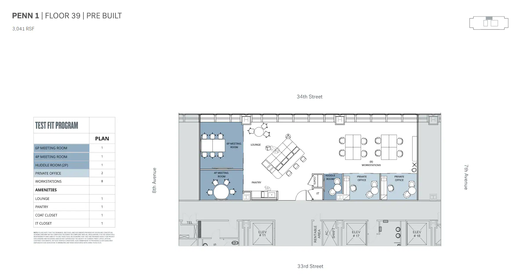 Layout includes 2 meeting rooms, 1 huddle room, 2 private offices, 8 workstations, lounge, pantry, coat closet and IT closet.