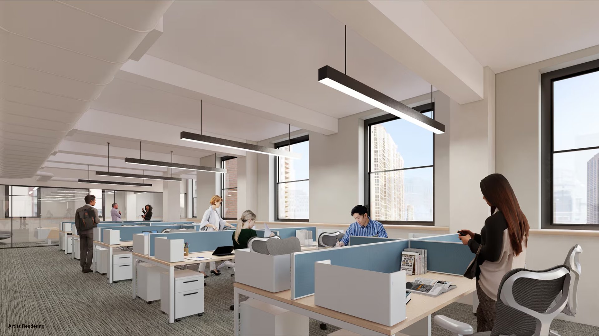 - 13 windowed private workspaces with glass-front, sliding-door entries providing a flexible mix of uses, and large reception area with open area for workrooms