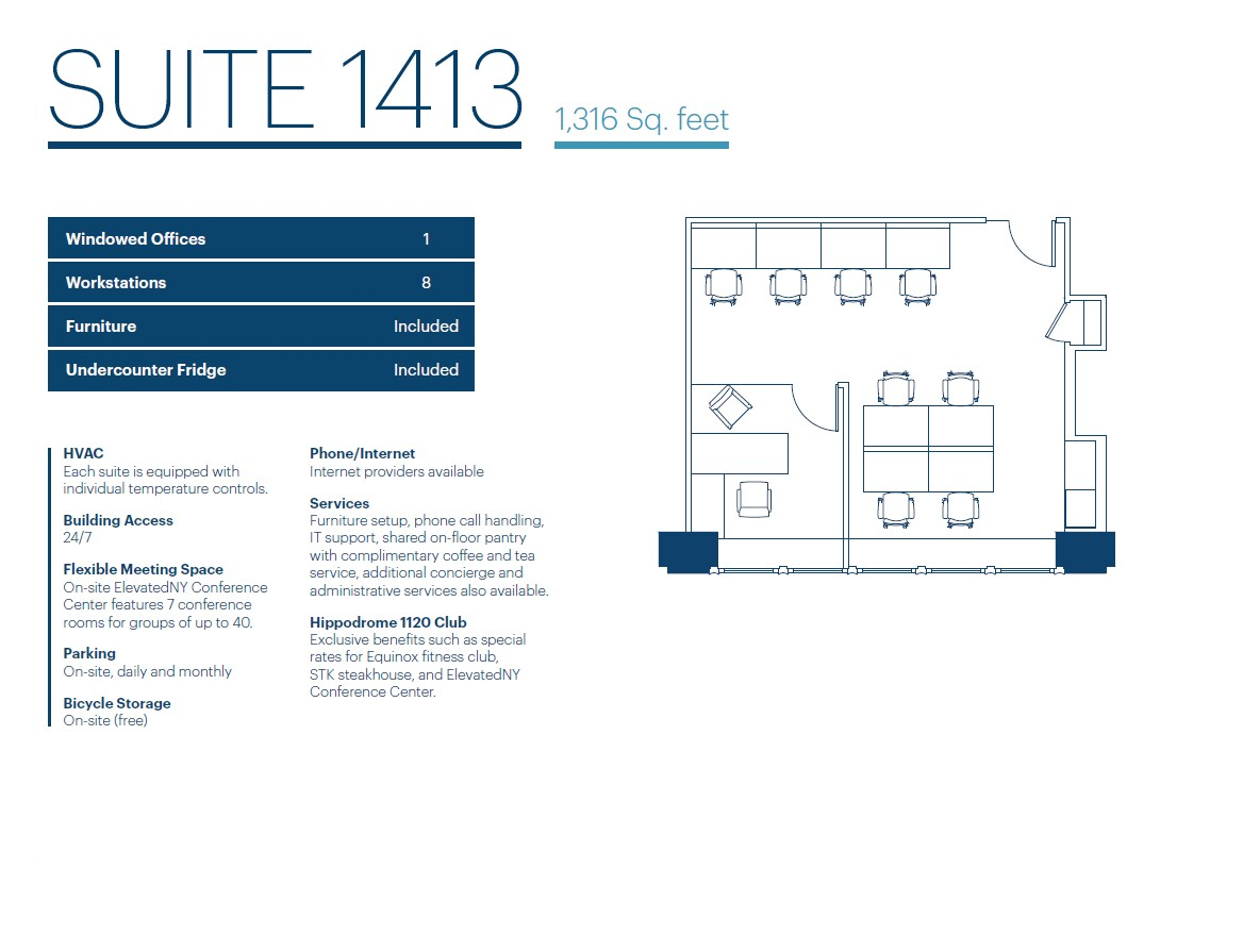 1120 Avenue of the Americas (Hippodrome) between West 43rd & West 44th Owned by: Edison Properties Class: A 615,000 Total RSF 21 floors Amenities: Lobby Attendant 24/7, Conference Center, On-site Restaurant Building Details HVAC: Each office is equipped with individual temperature controls for individualized comfort Building Access: 24/7 Conference Center: On-site, fits 2-40 people, 6 conference room options available Parking: On-site (discounts available Bicycle Storage: On-site (free) Phone/Internet: VOIP system and 7 high speed internet providers available Services: Rental furniture, reception answering, IT support, concierge and admin services available
