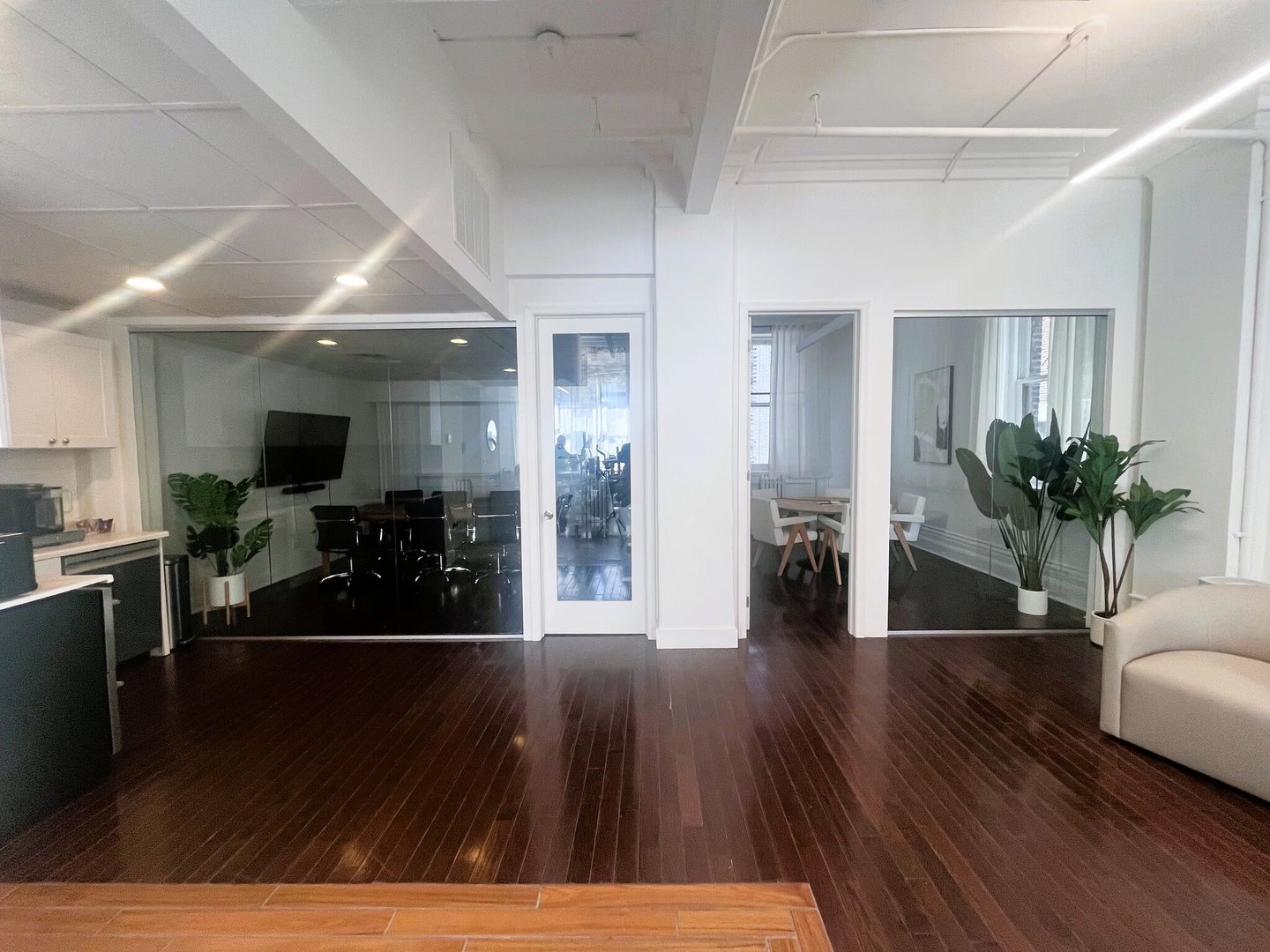 Suite 501 is a bright corner office with 7 oversized windows, 2 glass-enclosed conference rooms, wet pantry ,11-foot ceilings and new wood floors.