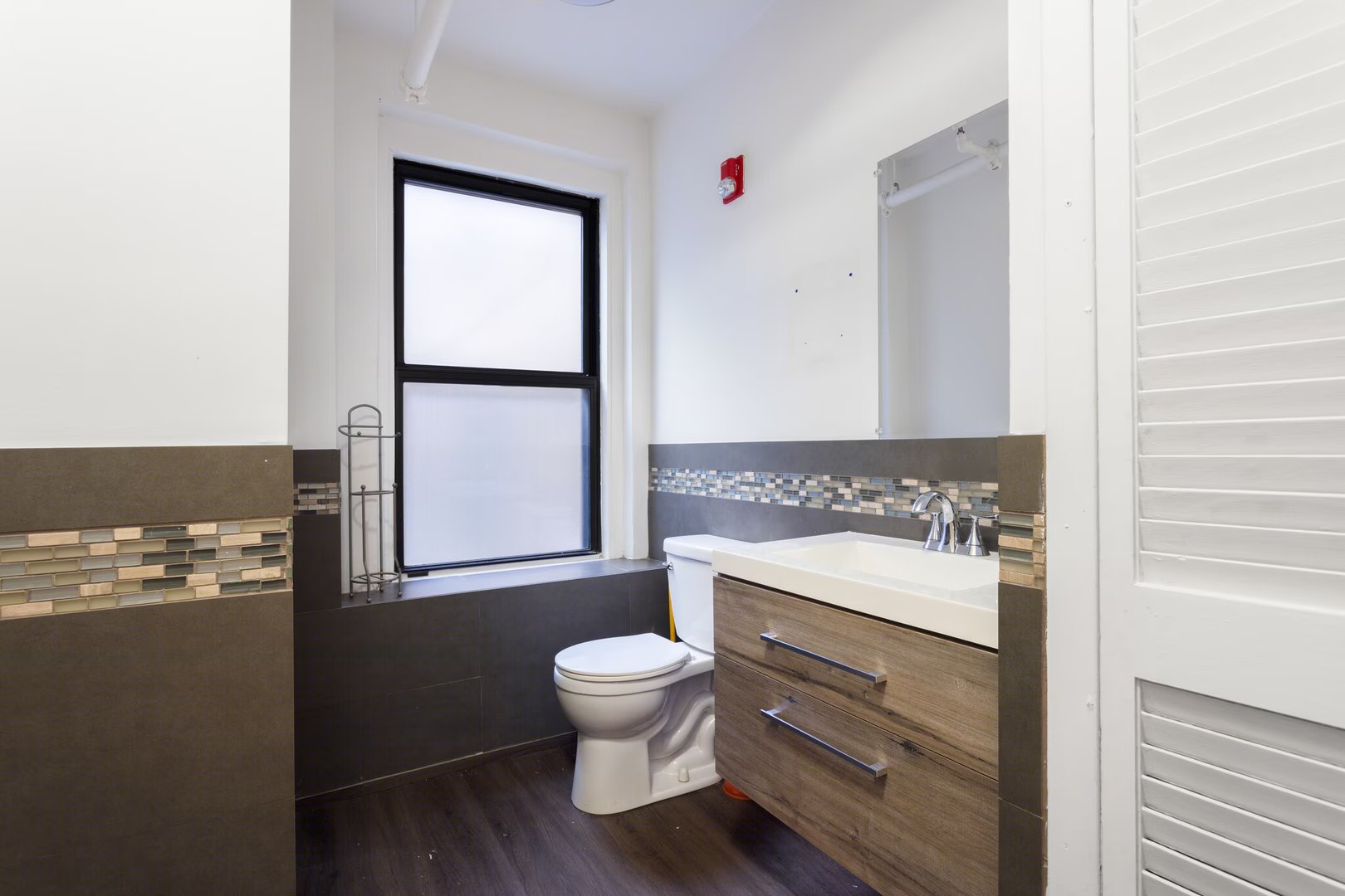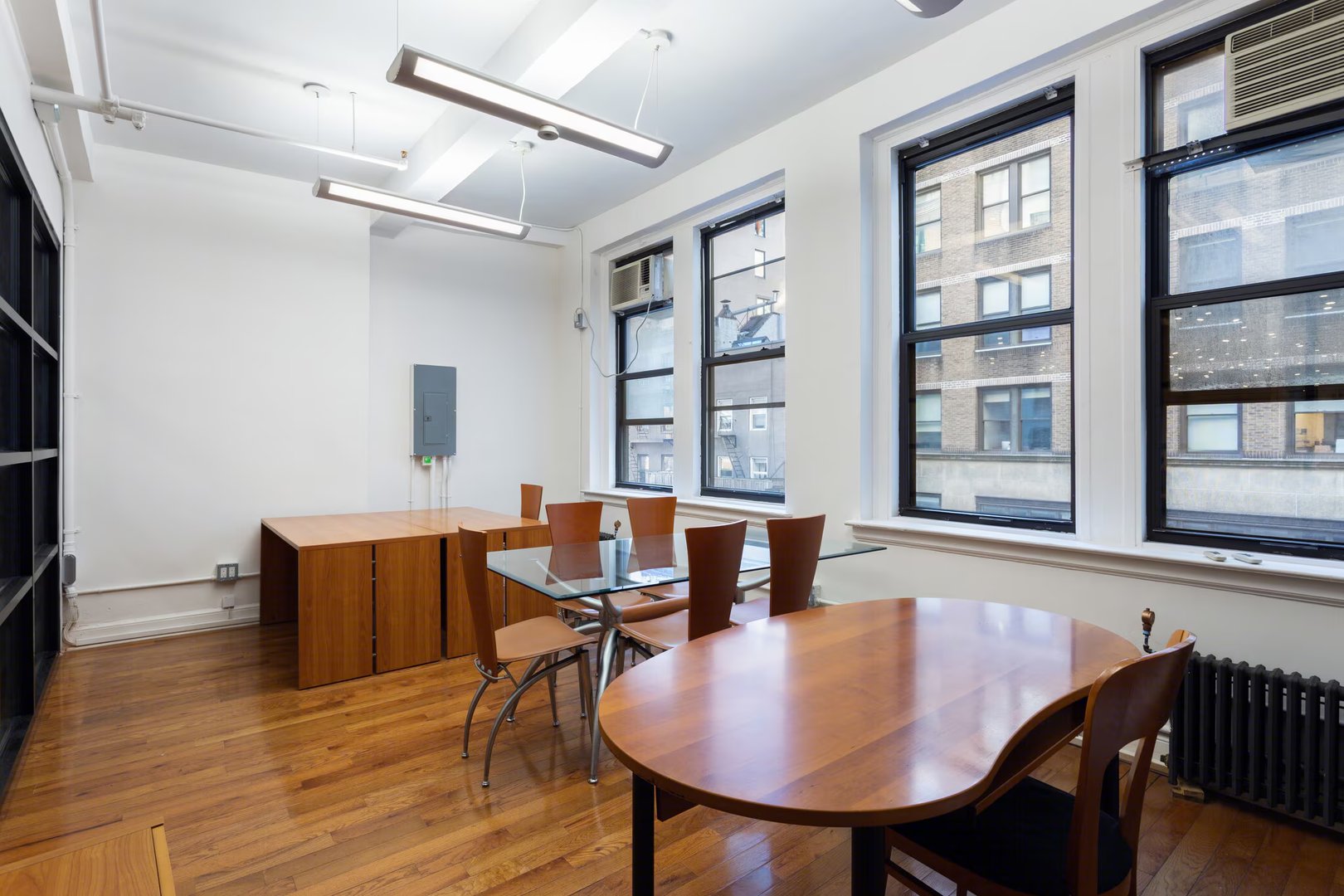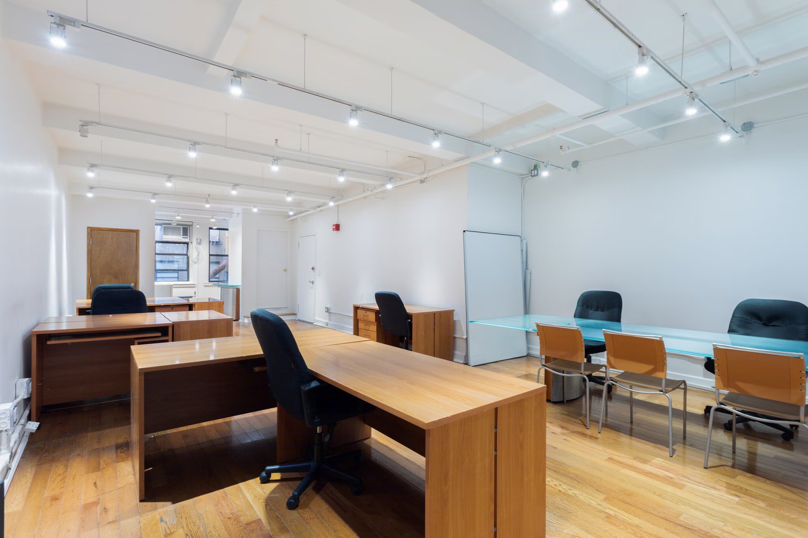 • Windows on north and south sides exposed brick track led lighting private restroom 2 private offices open area