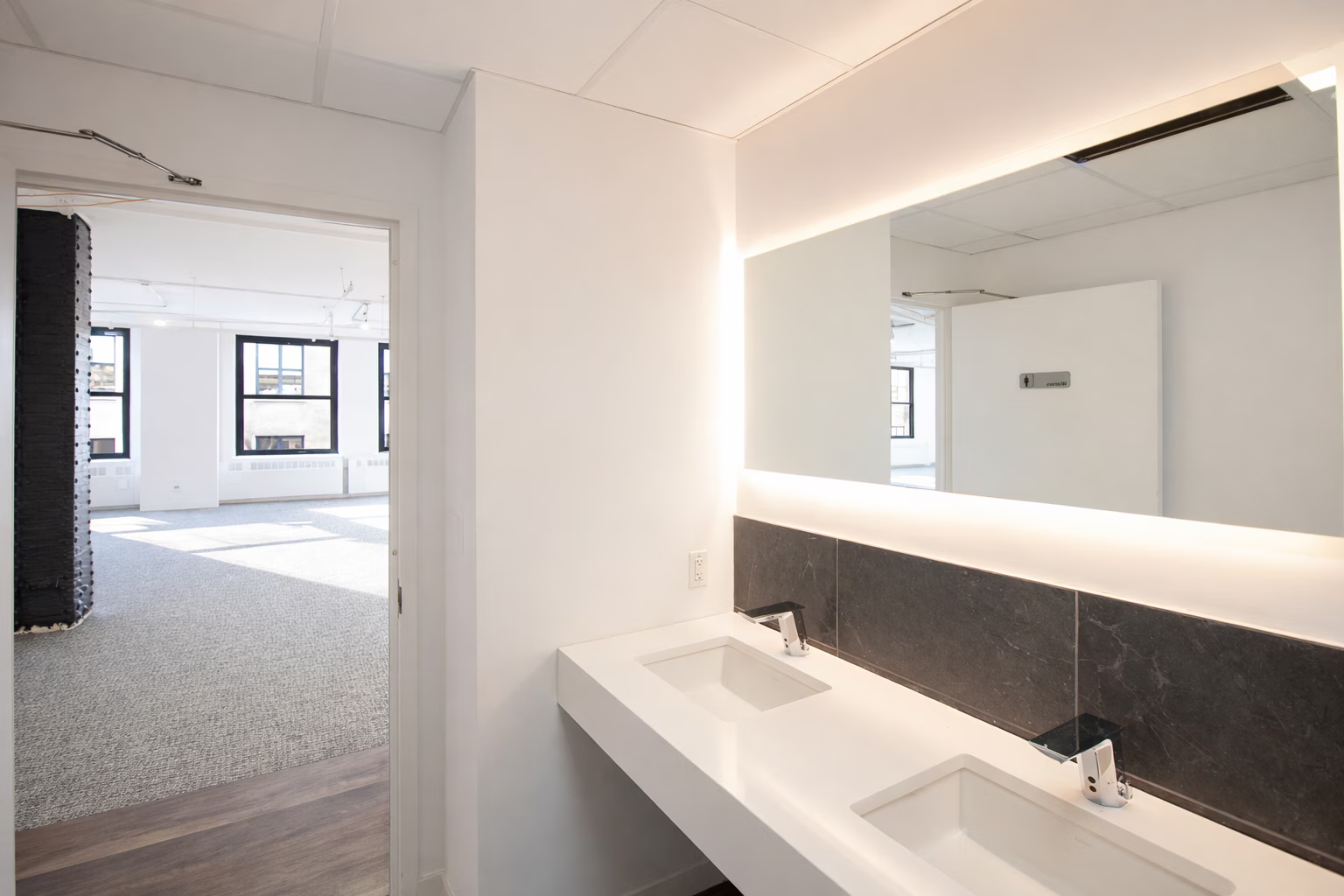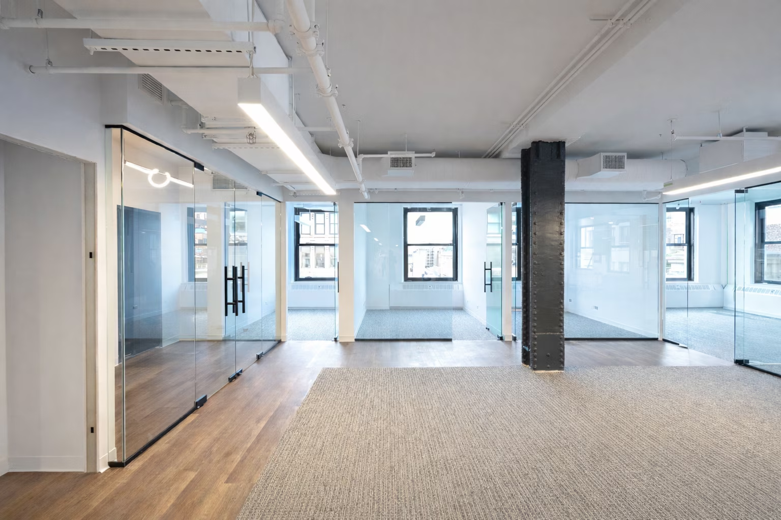 - Brand-new prebuilt office floor with 2 private offices, 2 conference rooms, kitchen with new appliances, a wellness room and private restrooms; additional space suitable for open workstations or private offices.