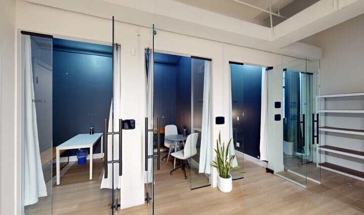 - The space is built with two (2) private offices/meeting rooms, one (1) conference room, four (4) phone rooms, wet pantry with café style seating, lounge area, and open space to accommodate 16-24 workstations.
