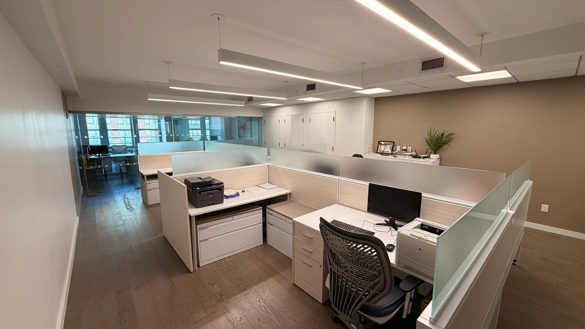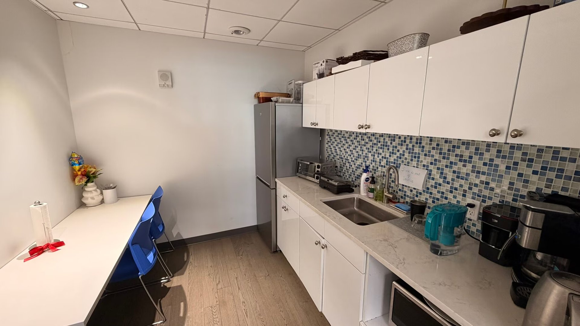 Furnished space offering open area with 6 workstations, pantry with sink, 1 private office, and 1 conference room