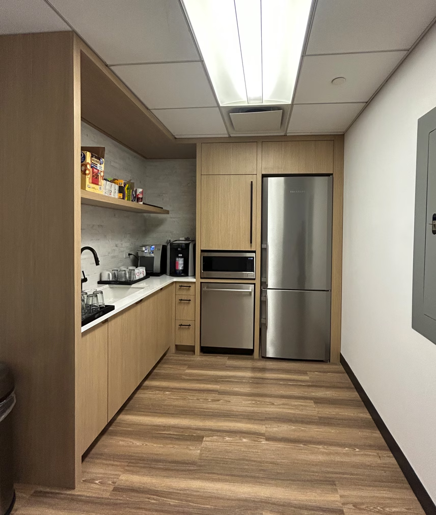 - The space features glass fronted offices and conference rooms with metal trim and a pantry with stainless steel appliances.