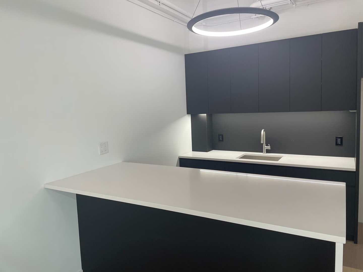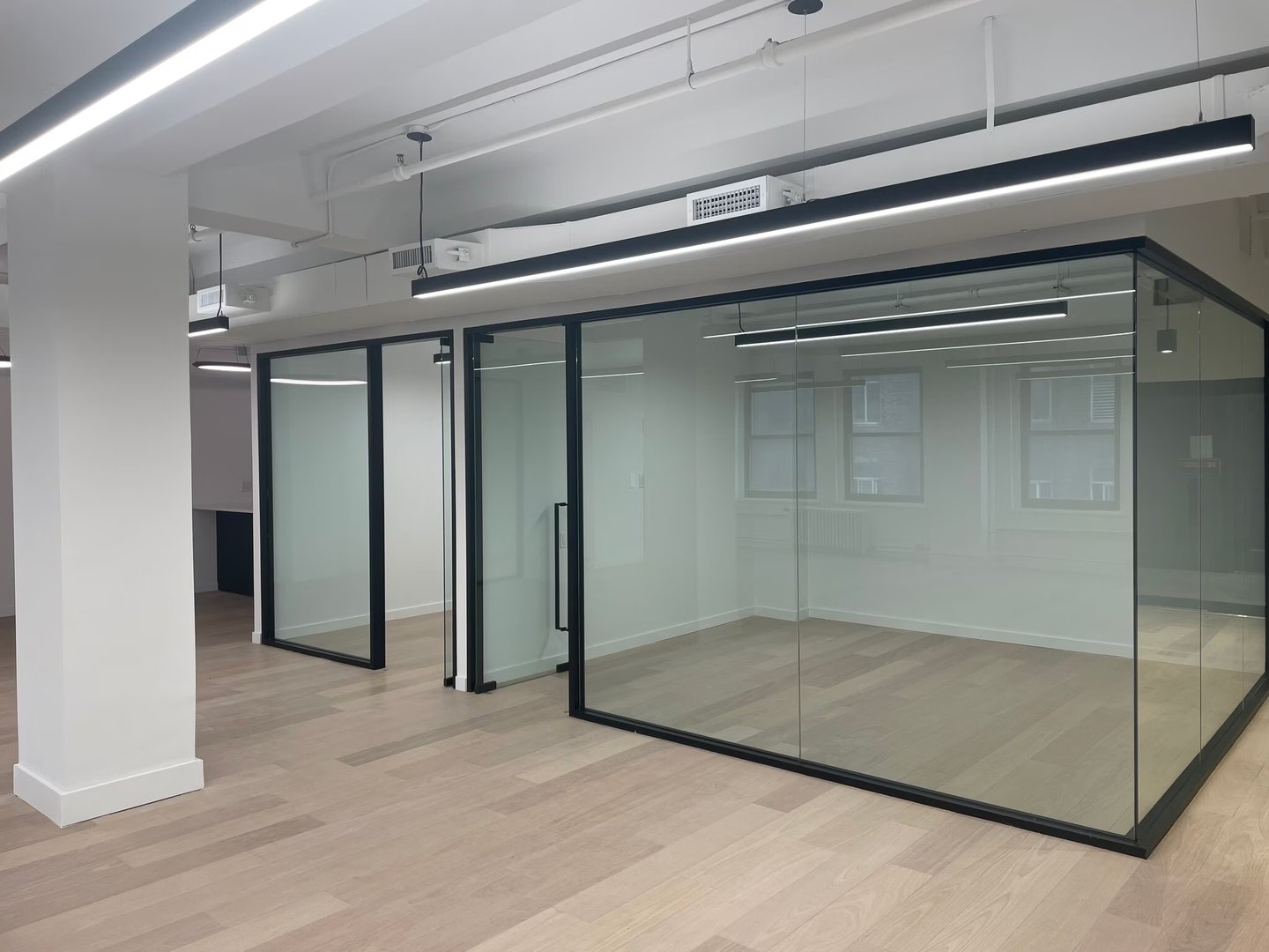 - Built space with two glass front offices/conference rooms, wood floors, exposed ceilings, and wet pantry with island