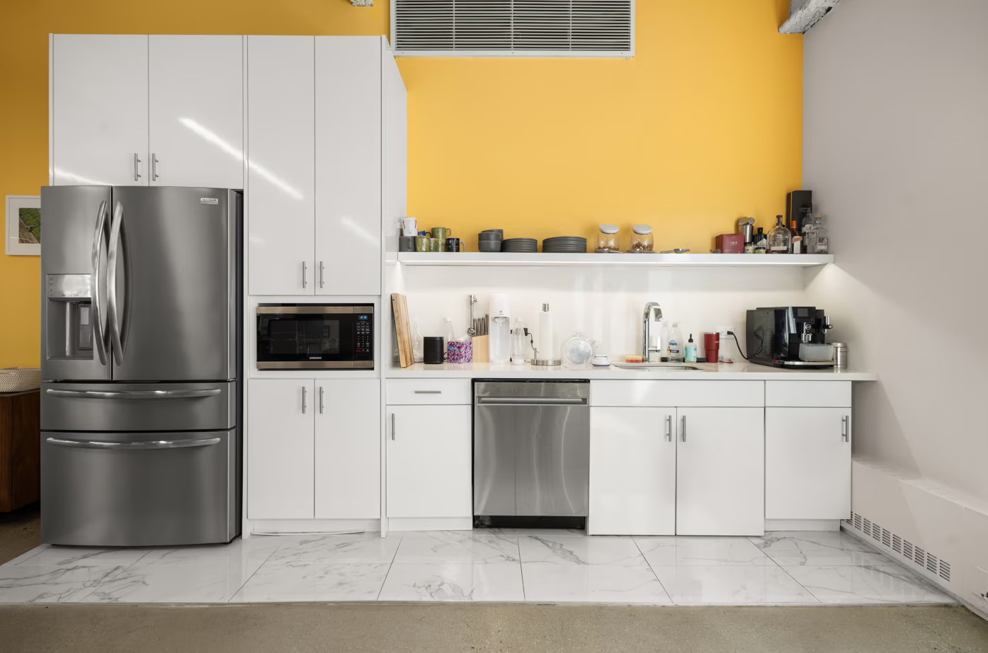 - High-end, creative installation with exposed ceilings and polished concrete floors