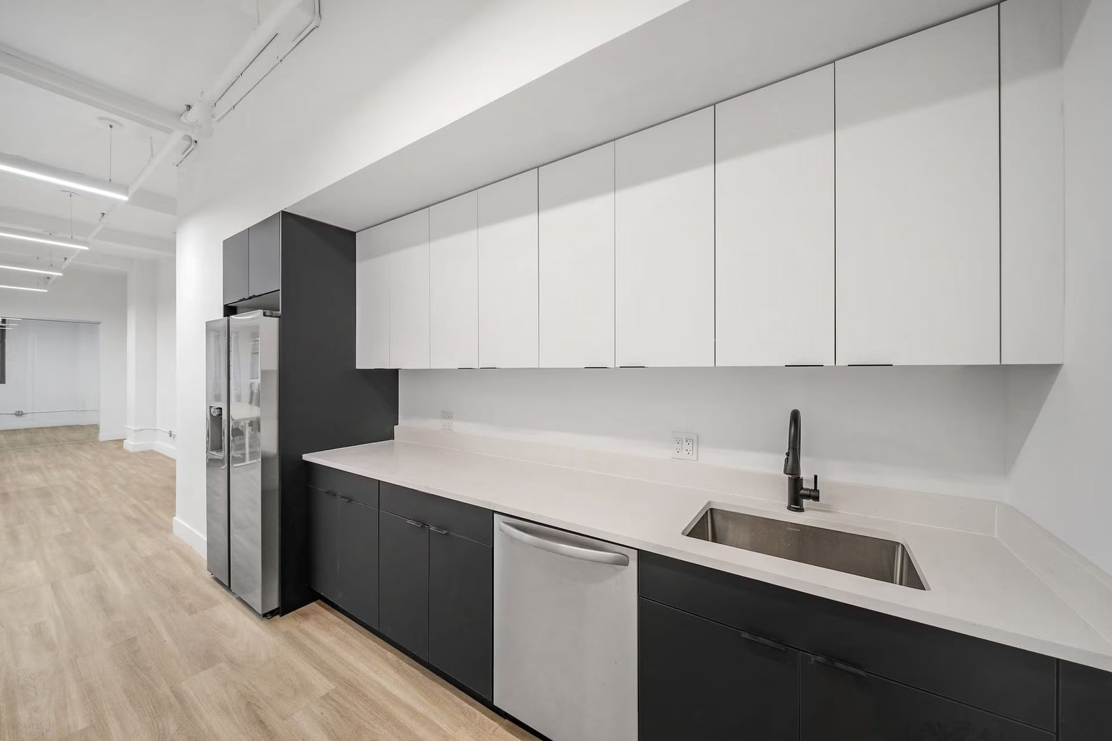 - This is a gorgeous, new prebuilt space with one glass-fronted conference room, one glass office, a brand-new wet pantry with top/bottom cabinetry and stainless-steel appliances, a brand-new ensuite bathroom with gorgeous tiling, brand-new flooring, and LED strip lights.