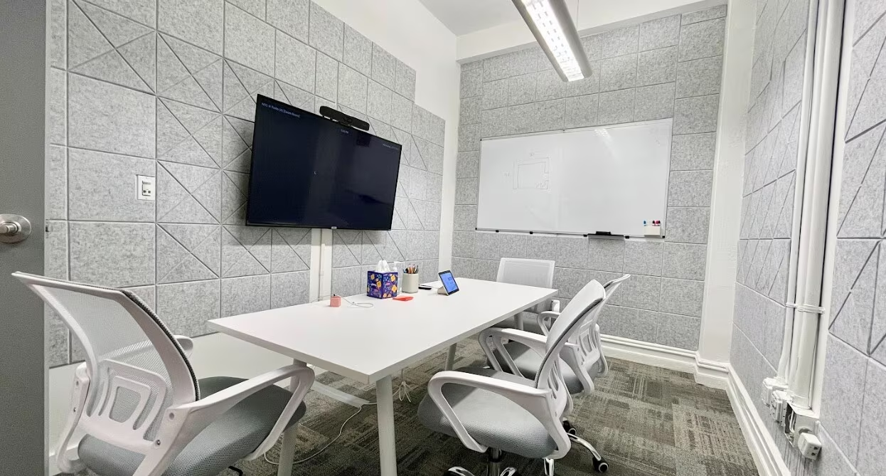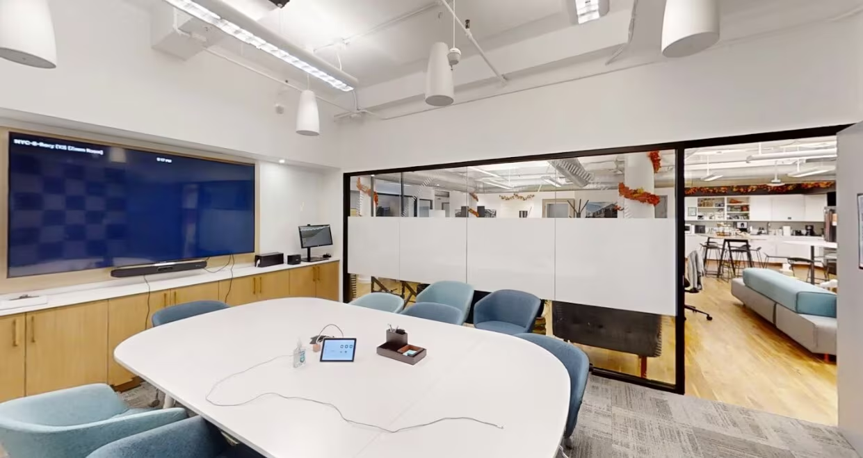 - Open floor plan with 7 private phone booths, 6 perimeter offices, and a glass-enclosed conference room.
