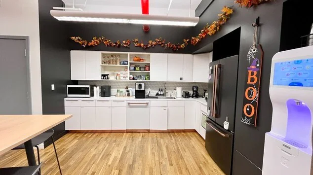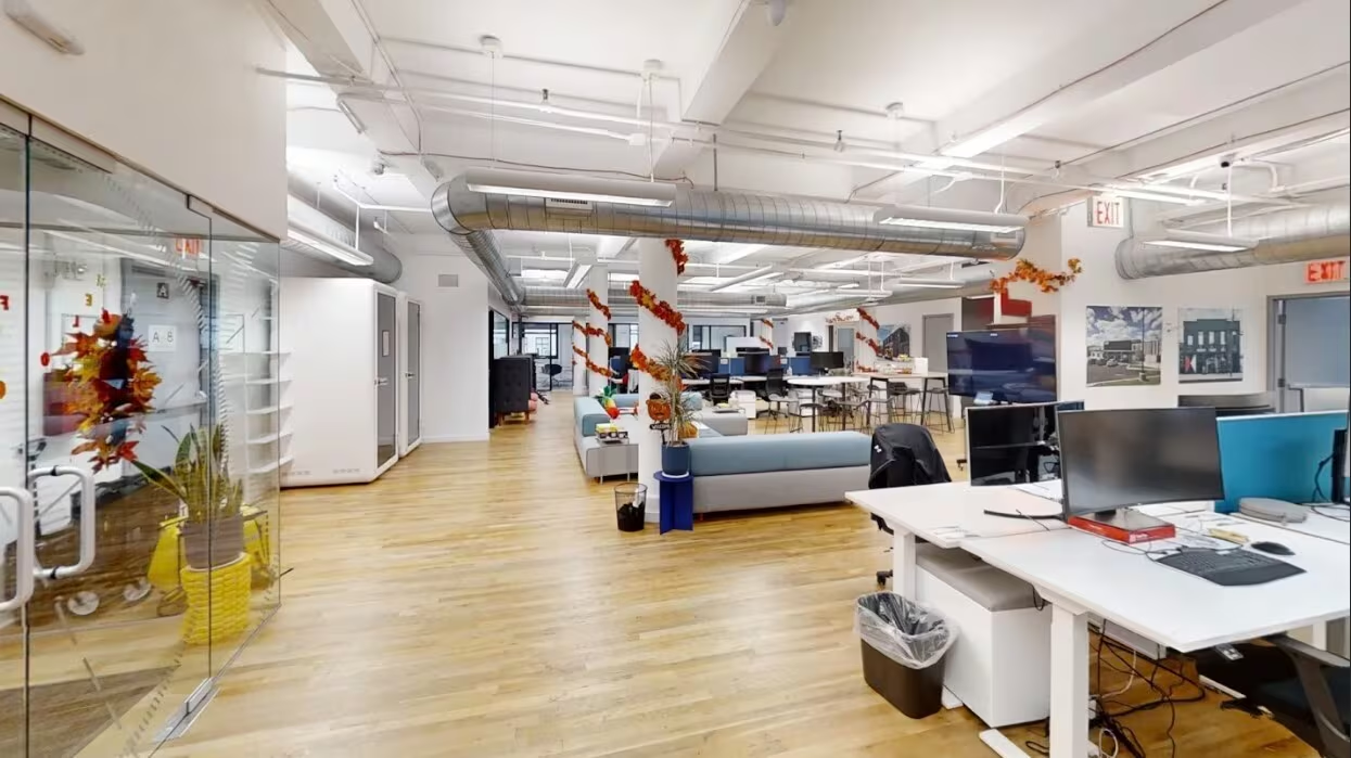 - Hardwood floors, open ceilings, and modern glass-fronted offices create a sleek, contemporary aesthetic.
