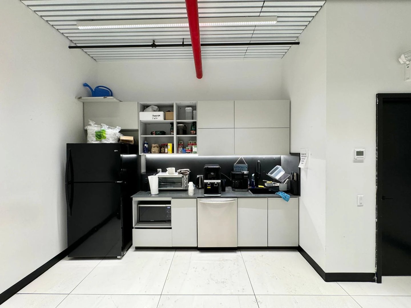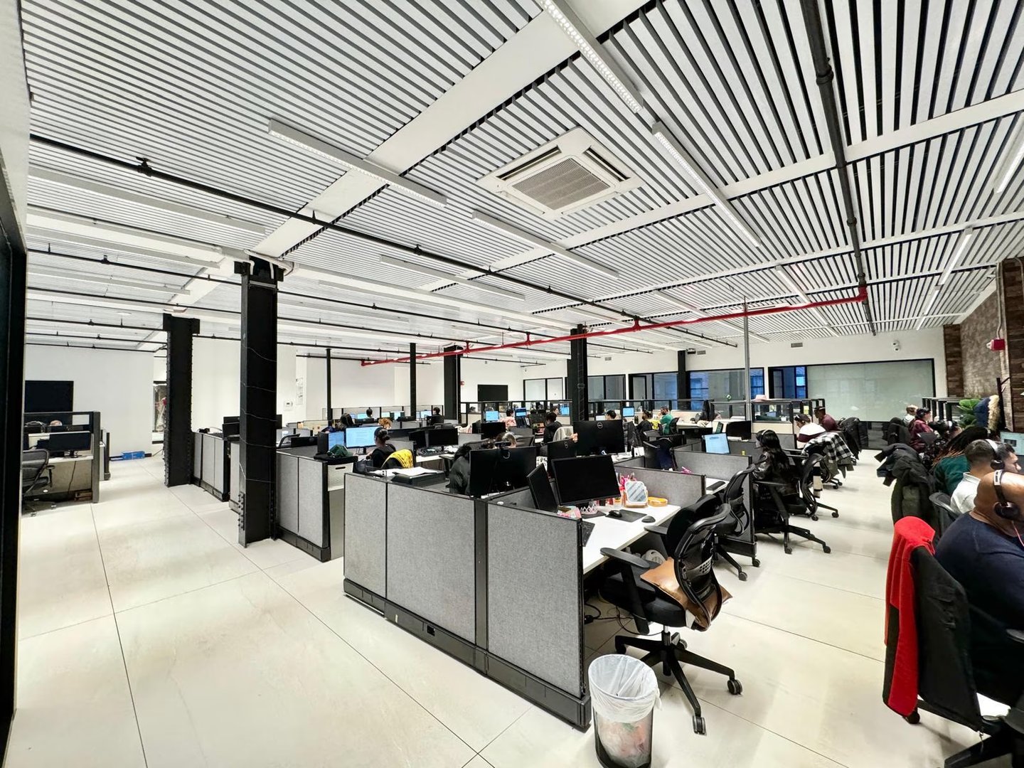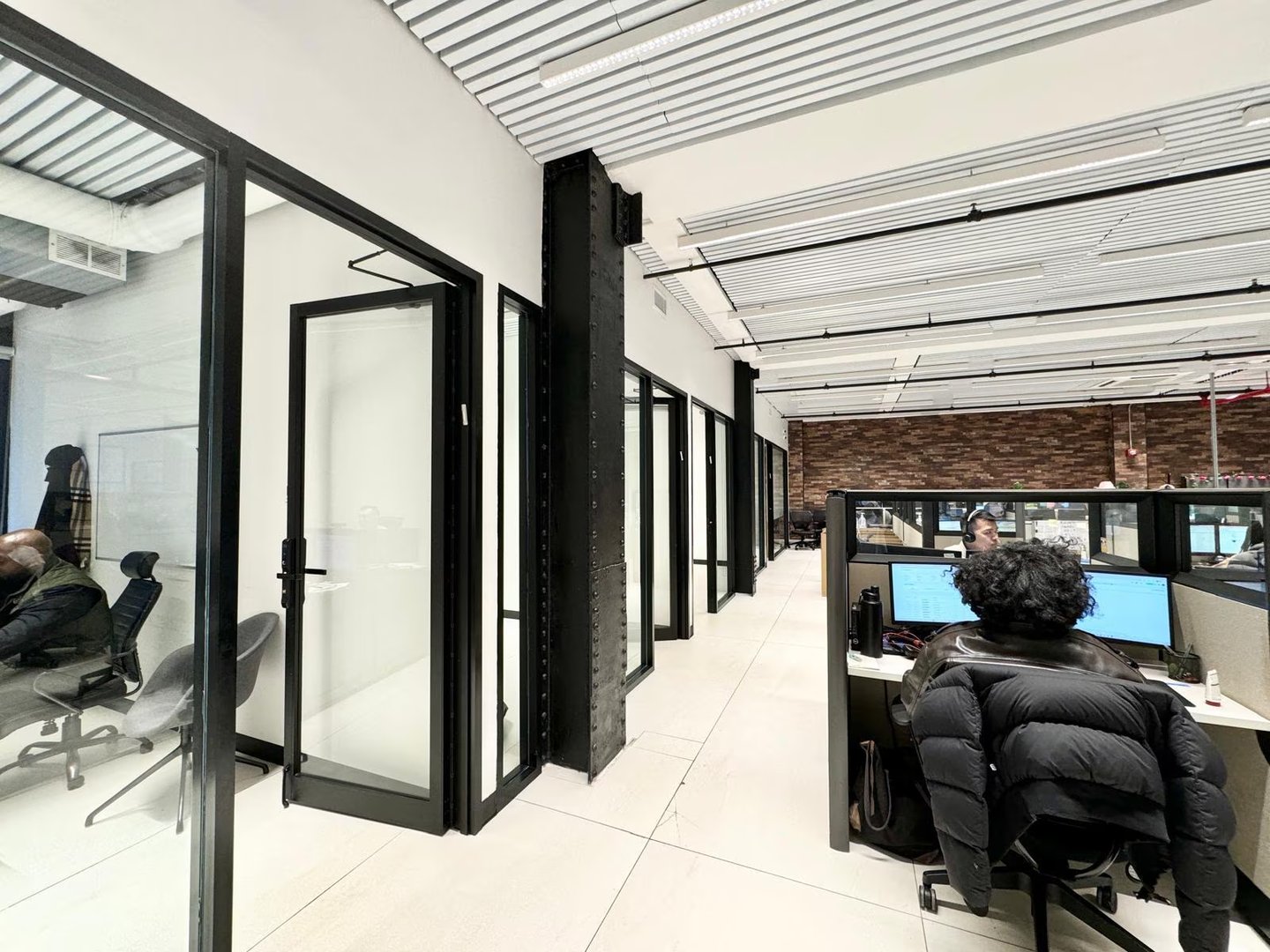 - Glass-fronted private offices and conference rooms, tiled flooring throughout, multi-zoned VRF systems, modern LED strip lighting, wet pantry, and generous open seating areas.