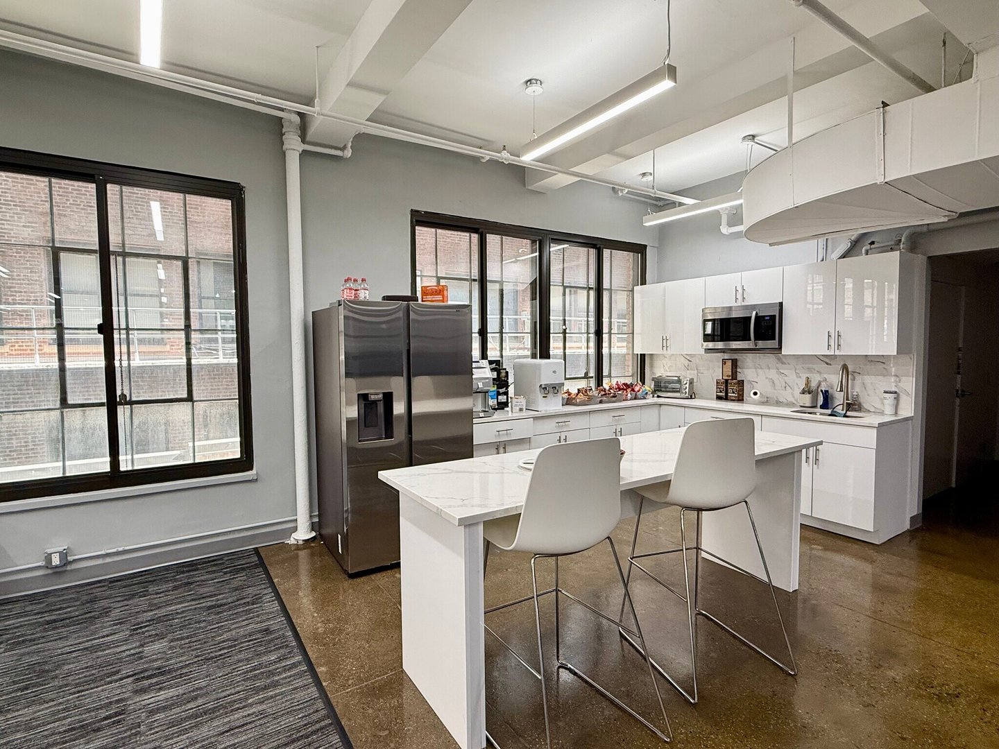 - Layout consists of 3 private offices/meeting rooms with glass fronts, 1 large conference room, open area with 30+ desks, and a new café style wet pantry