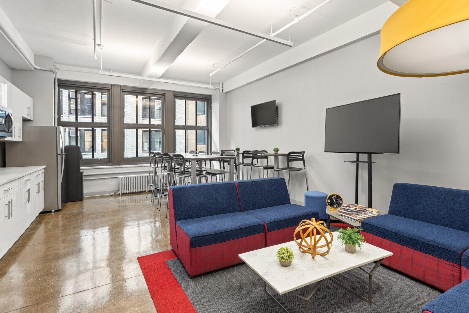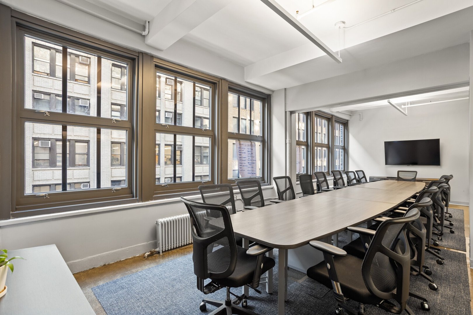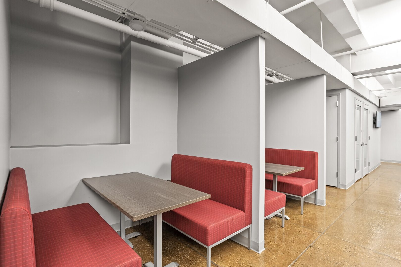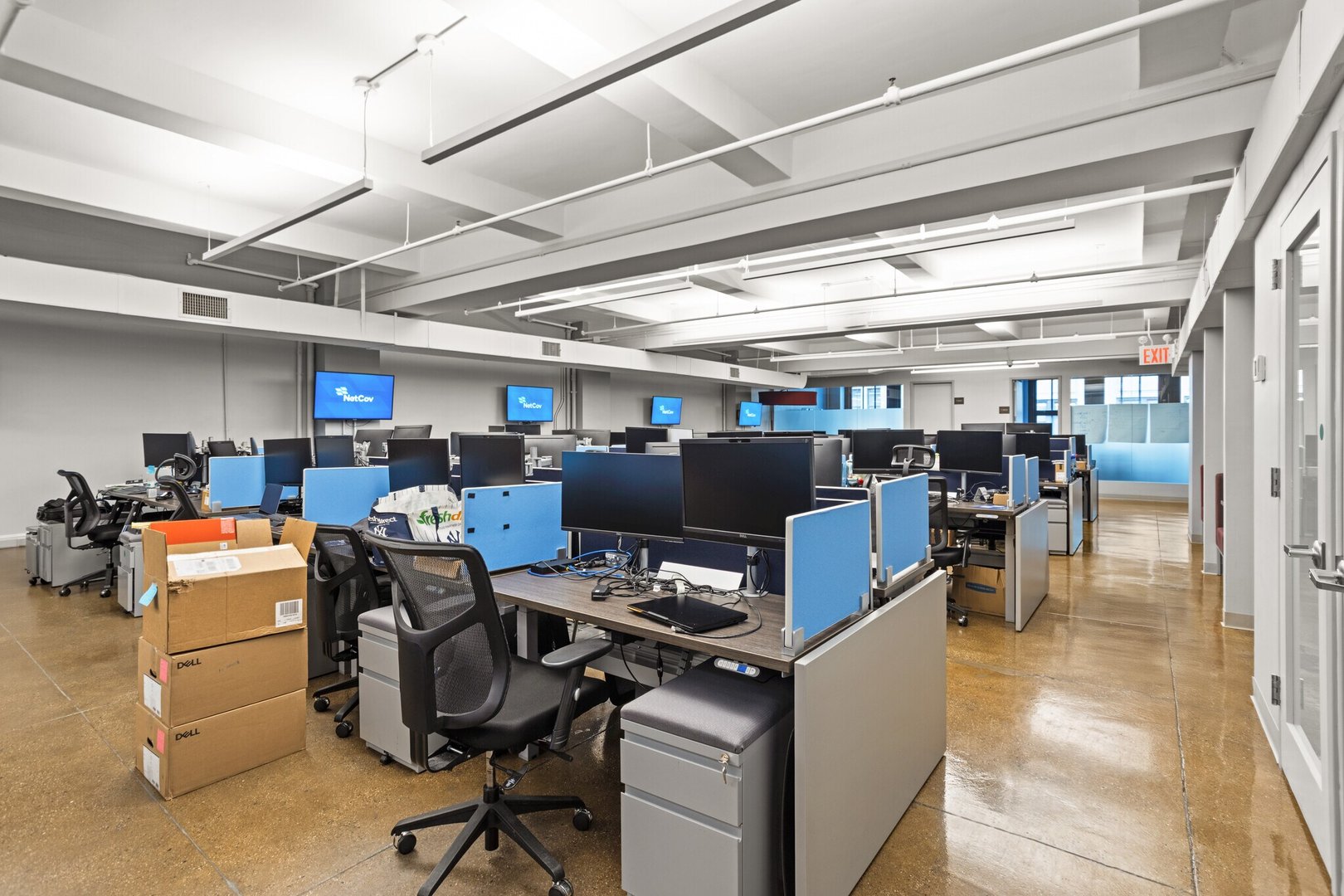 - Layout consists of 1 large board room with an accordion wall to divide it, 2 built in phone rooms, open area with 40 desks, and a large café style wet pantry