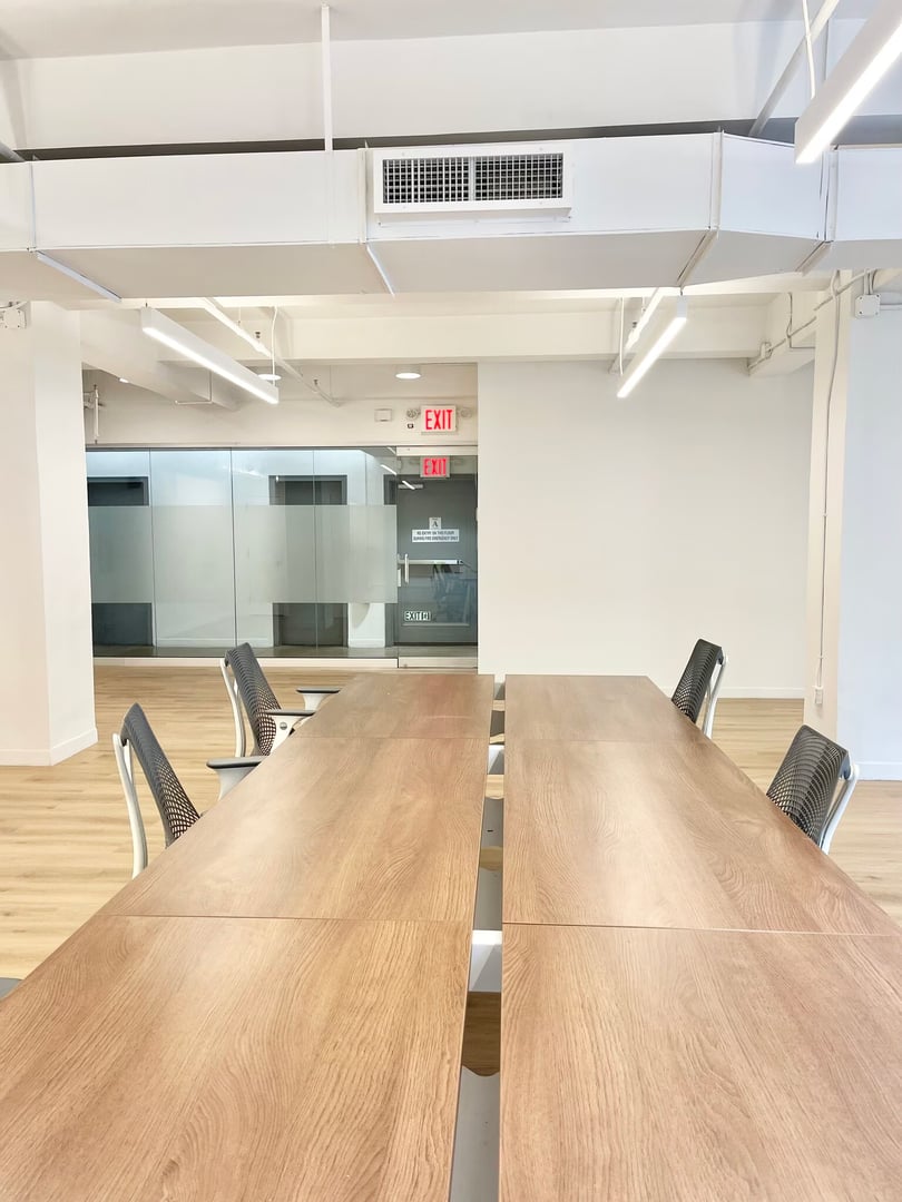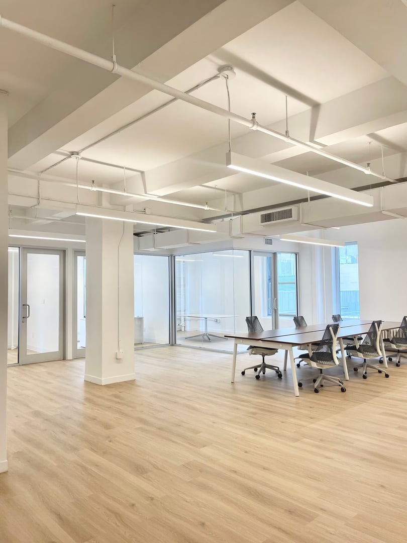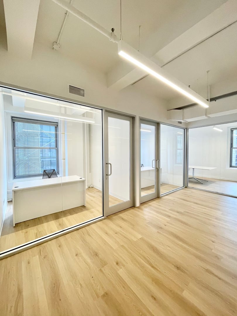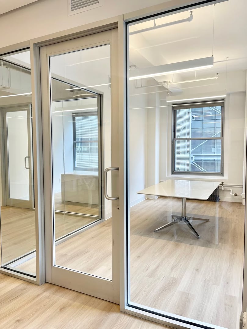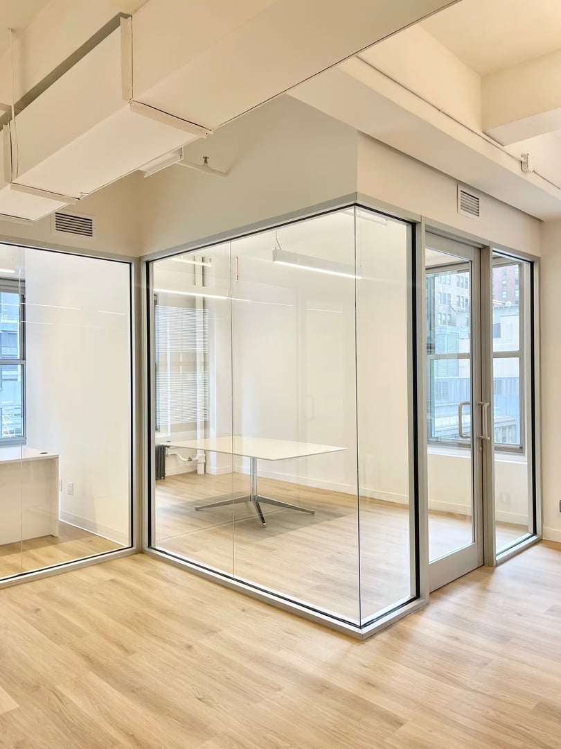 - Modern pre-built move in ready with a wet pantry, two glass fronted private offices, one glass fronted conference room, and an open collaboration area.