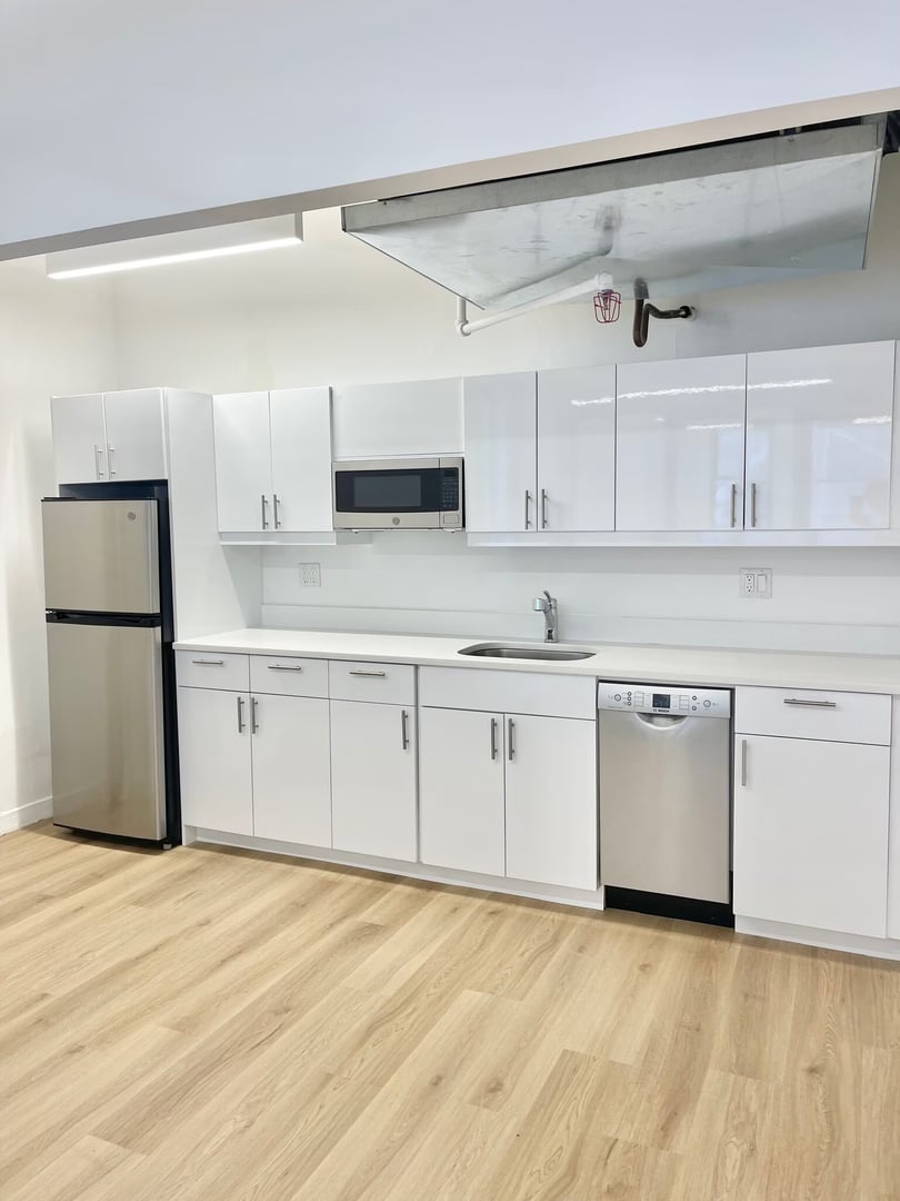 - New high-gloss white, high-end pantry with stainless steel appliances.