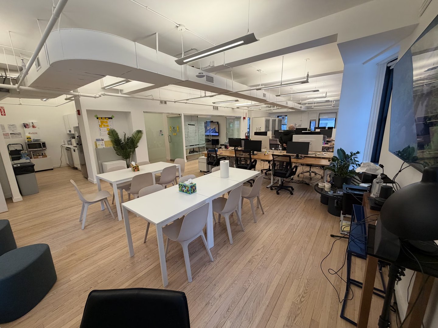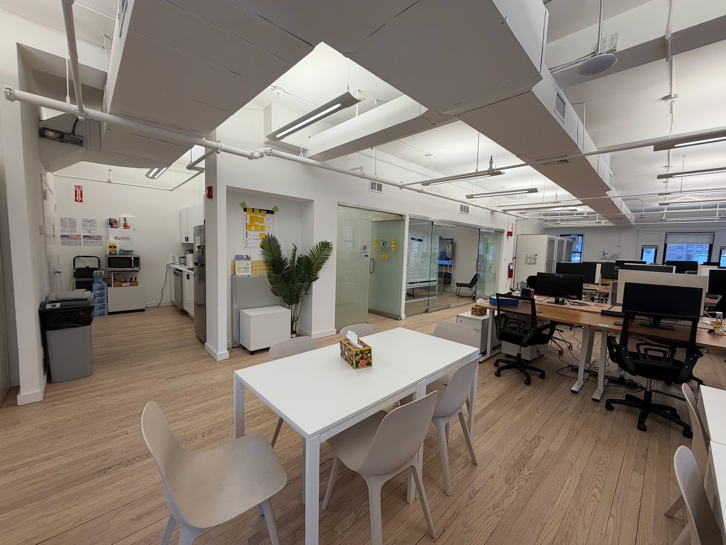 - Space features exposed ceilings and wood floors and currently built and furnished with 3 meeting rooms, 1 large conference room, and open space for 28 desks sit/stand desks.