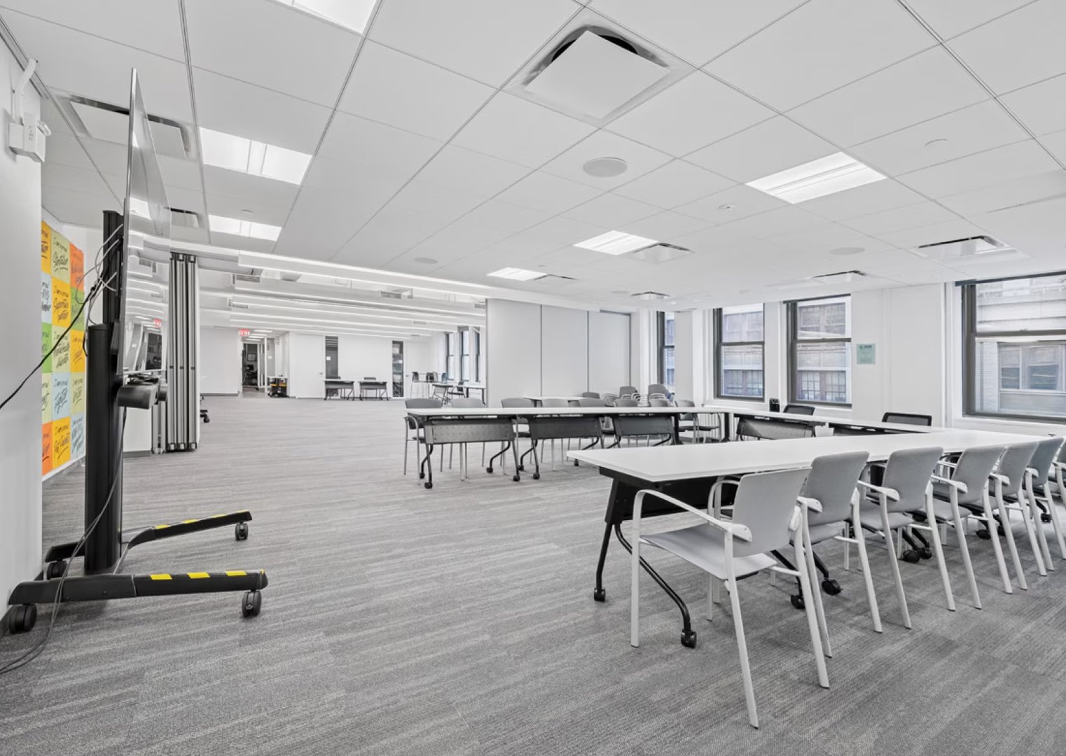 - Large open area with an accordion-style collapsible wall to divide the space that can accommodate up to 65 people.