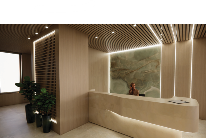- Layout includes 4 offices, 1 executive office, open area reception, lounge and pantry.