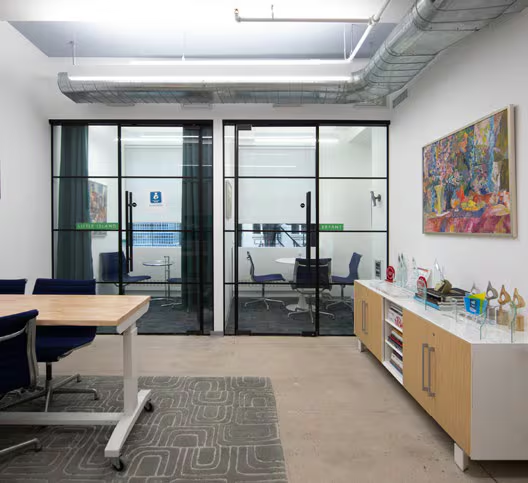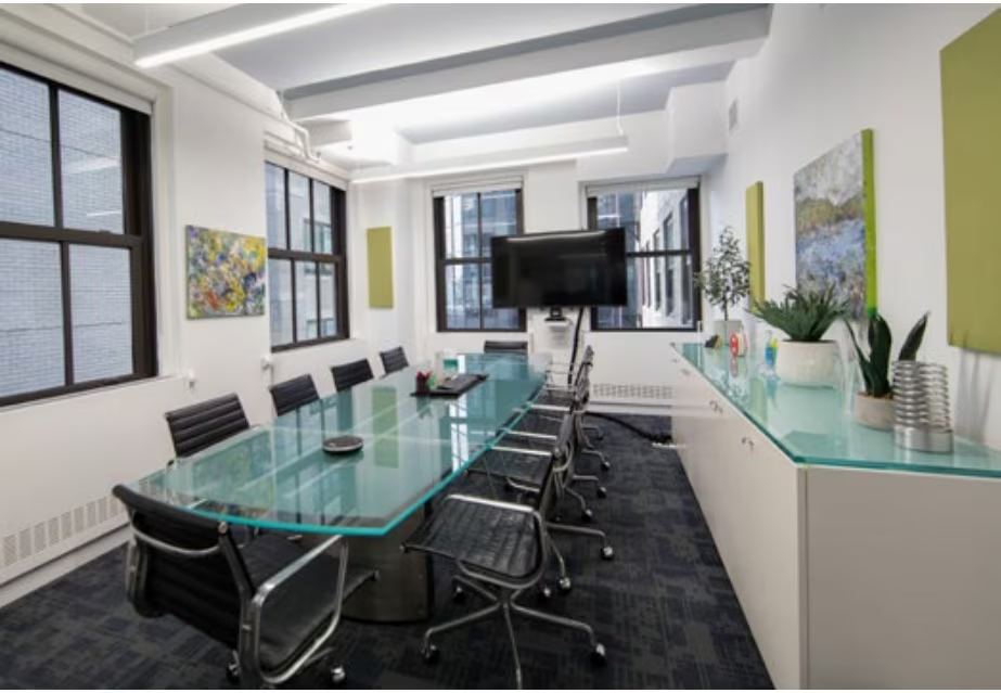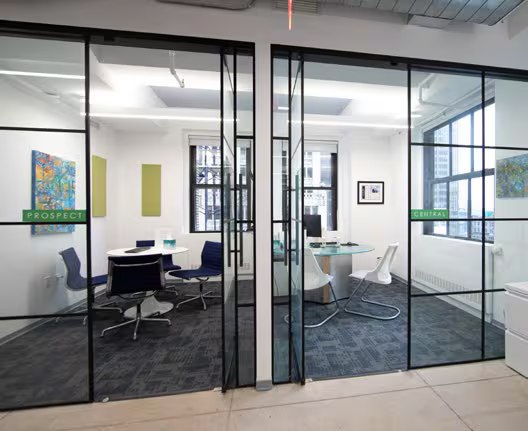 - 2 windowed offices, 2 glass enclosed phone booths, approximately 10 workstations, 10-person conference room