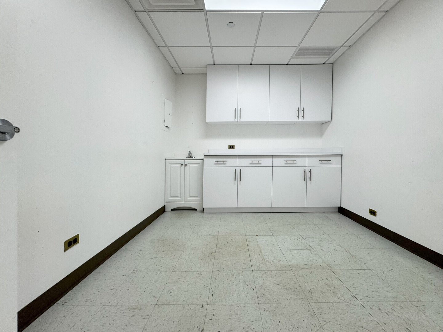 Built corner medical space with 3 windowed office/consultation rooms, 3 exam rooms with sinks, reception/waiting area, lab room, and administrative/billing office