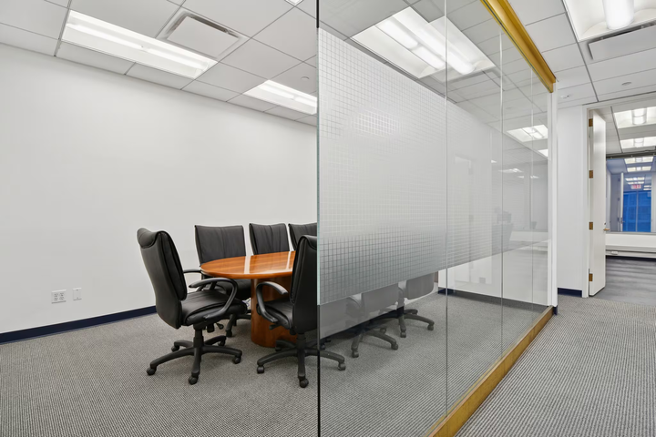- Built installation featuring 3 private offices, 1 conference room, storage area, and pantry.