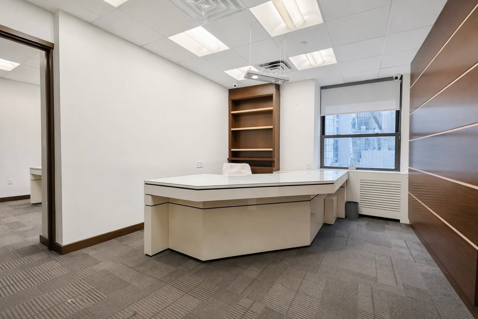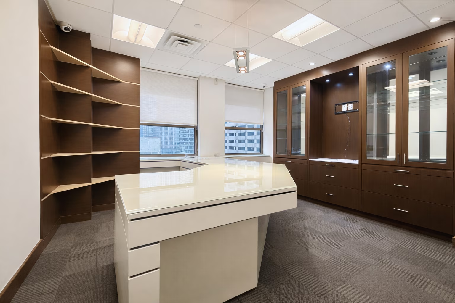 Large windows are located within two private offices, filling them with natural light and creating bright, comfortable executive spaces.