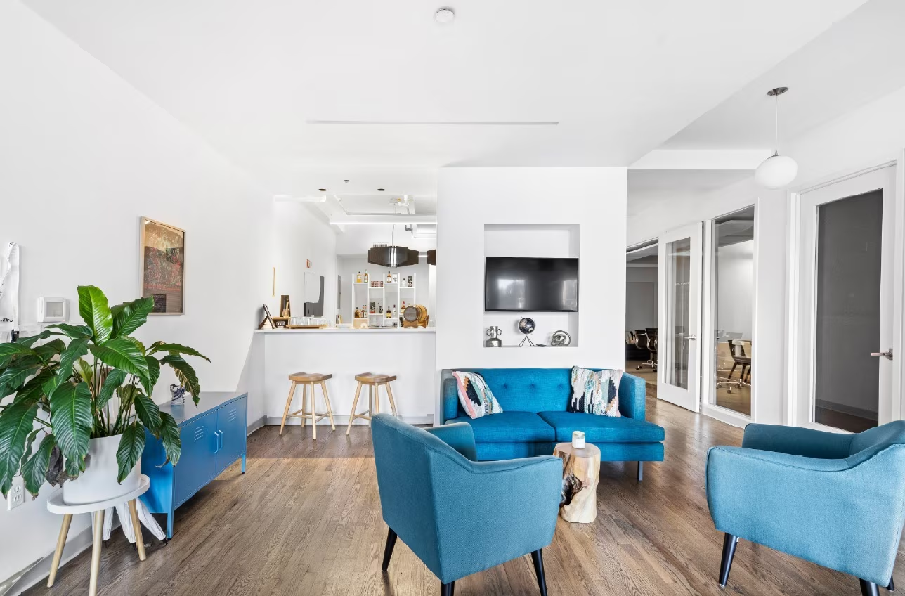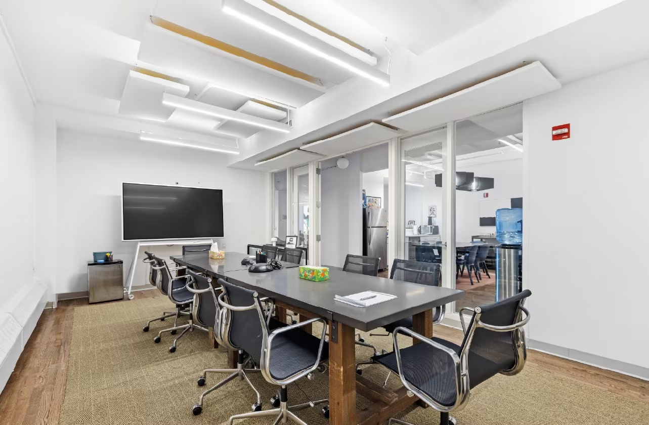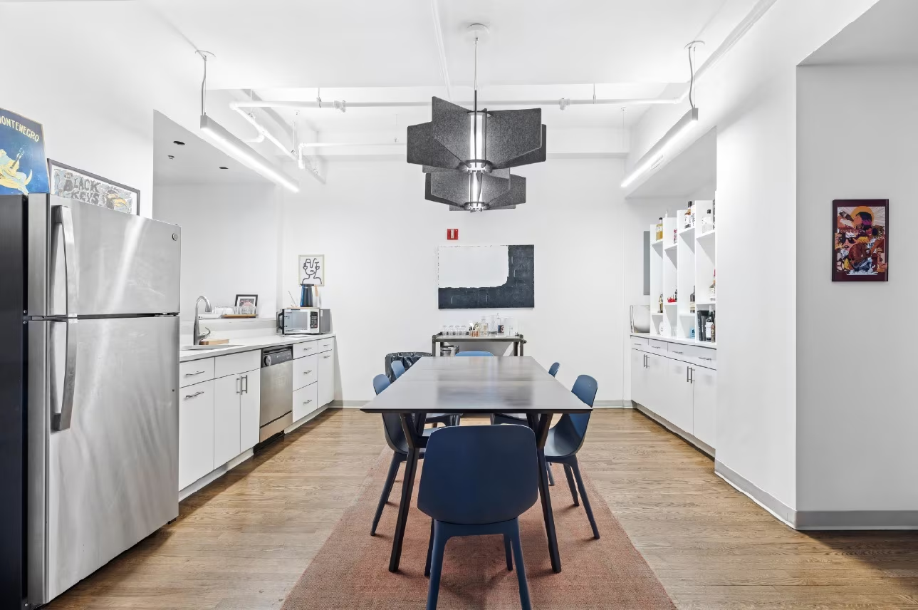 - One windowed office, two interior offices, 10-person conference room, open area with 10 workstations, and large open pantry.