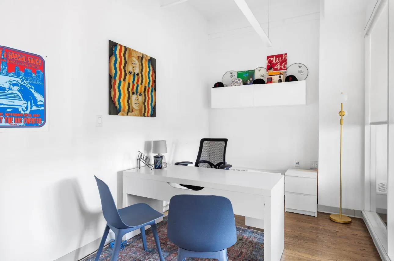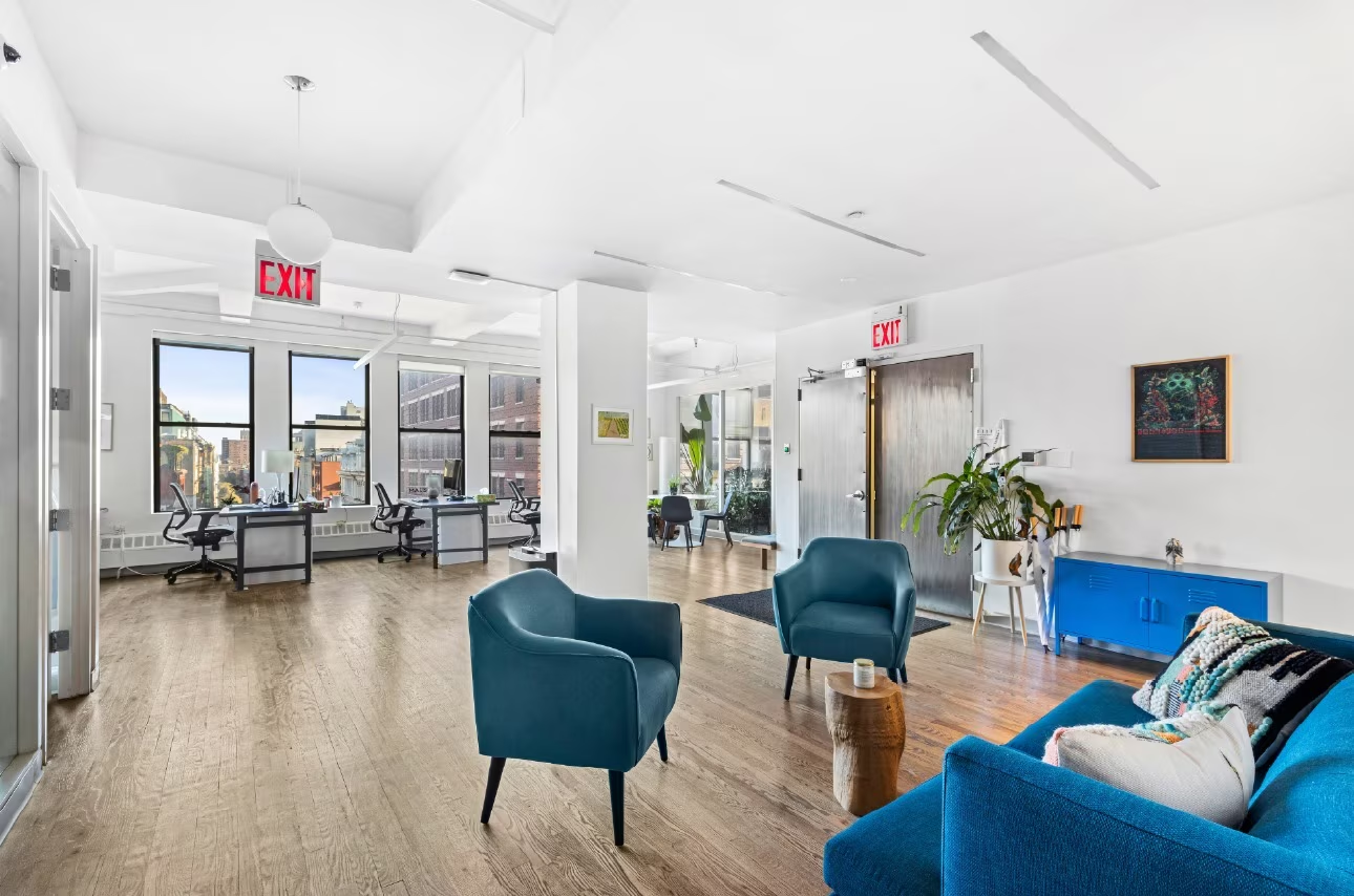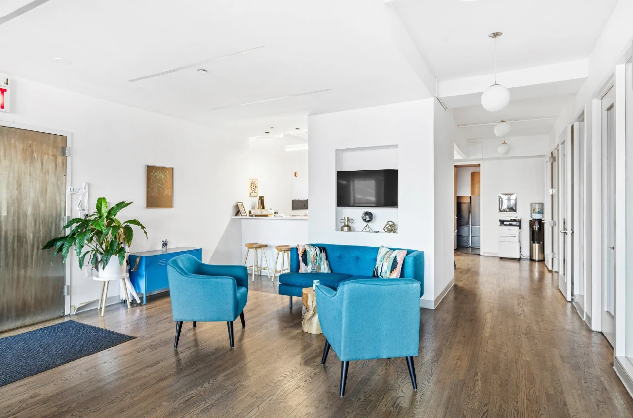 - One windowed office, two interior offices, 10-person conference room, open area with 10 workstations, and large open pantry.