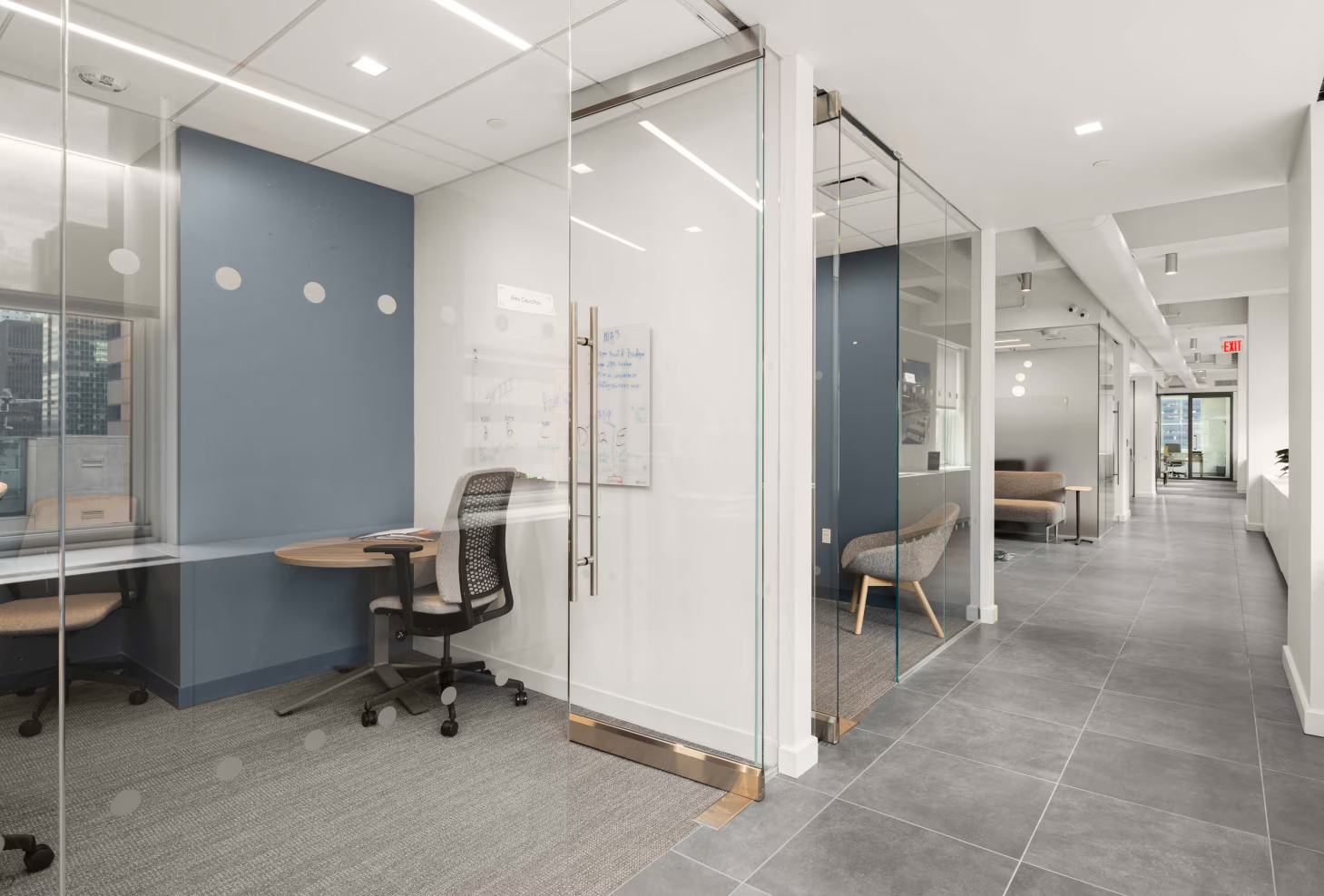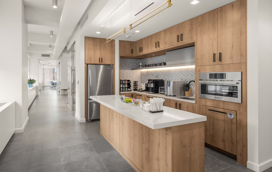 - Existing high-end layout features 2 conference rooms, 9 offices, 1 private room, open area with 17 workstations, printer/copy area, high-end pantry, and reception area