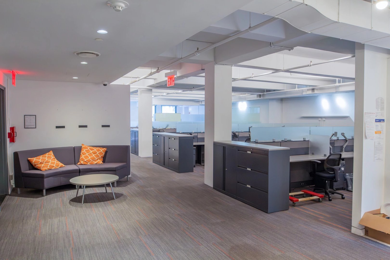 2 conference rooms, semi-enclosed office, podcast / sound proof room, print/copy room, IT room, large eat- in pantry, 36 workstations and ability to easily add offices